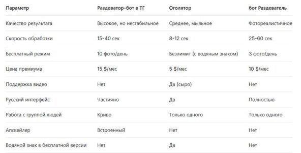 Ниже представлена таблица сравнения всех трех ботов по ключевым параметрам, что позволит наглядно увидеть различия.